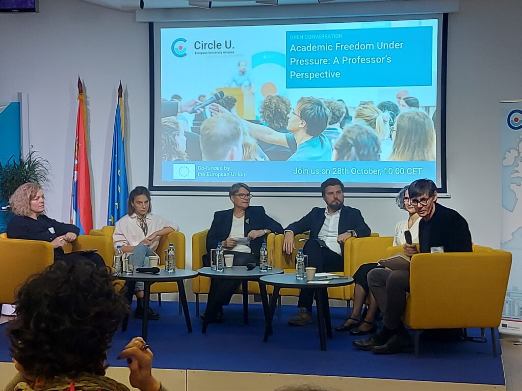 О овим питањима разговарало се на отвореном разговору „Academic Freedom Under Pressure – A Professor’s Perspective“, одржаном 28. октобра 2025. године, који је окупио професоре и истраживаче из више европских универзитета у Београду. Учесници су анализирали могућности и ризике јавног ангажовања академске заједнице, преиспитујући границе између научног рада, личног изражавања и политичког активизма.