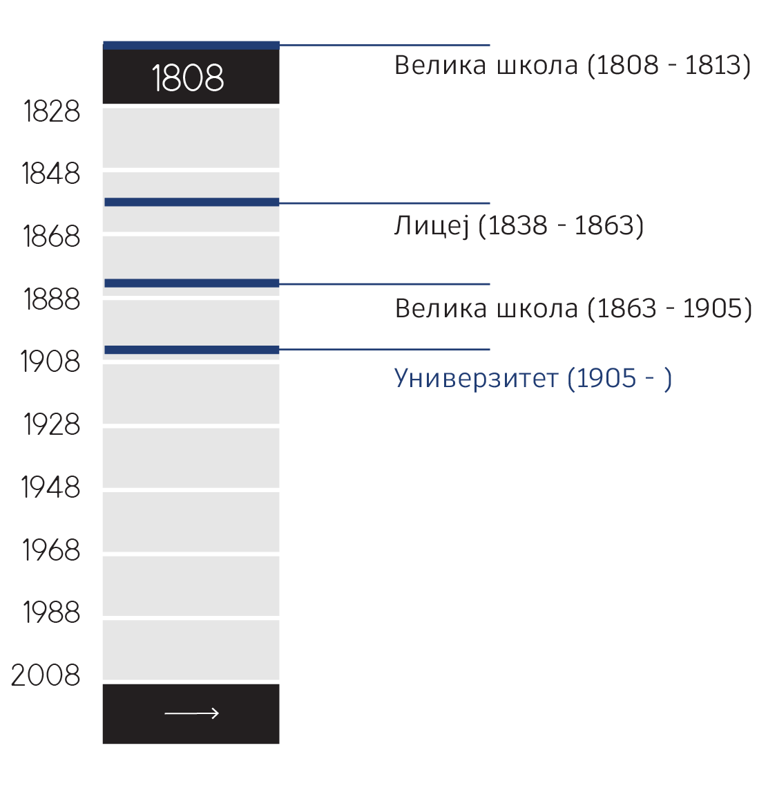 Развој Универзитета се може пратити од 1808. године. У временском развоју се издвајају периоди Велике школе (1808 – 1813), Лицеја (1838-1863), Велике школе (1863-1905) и Универзитета (1905-).